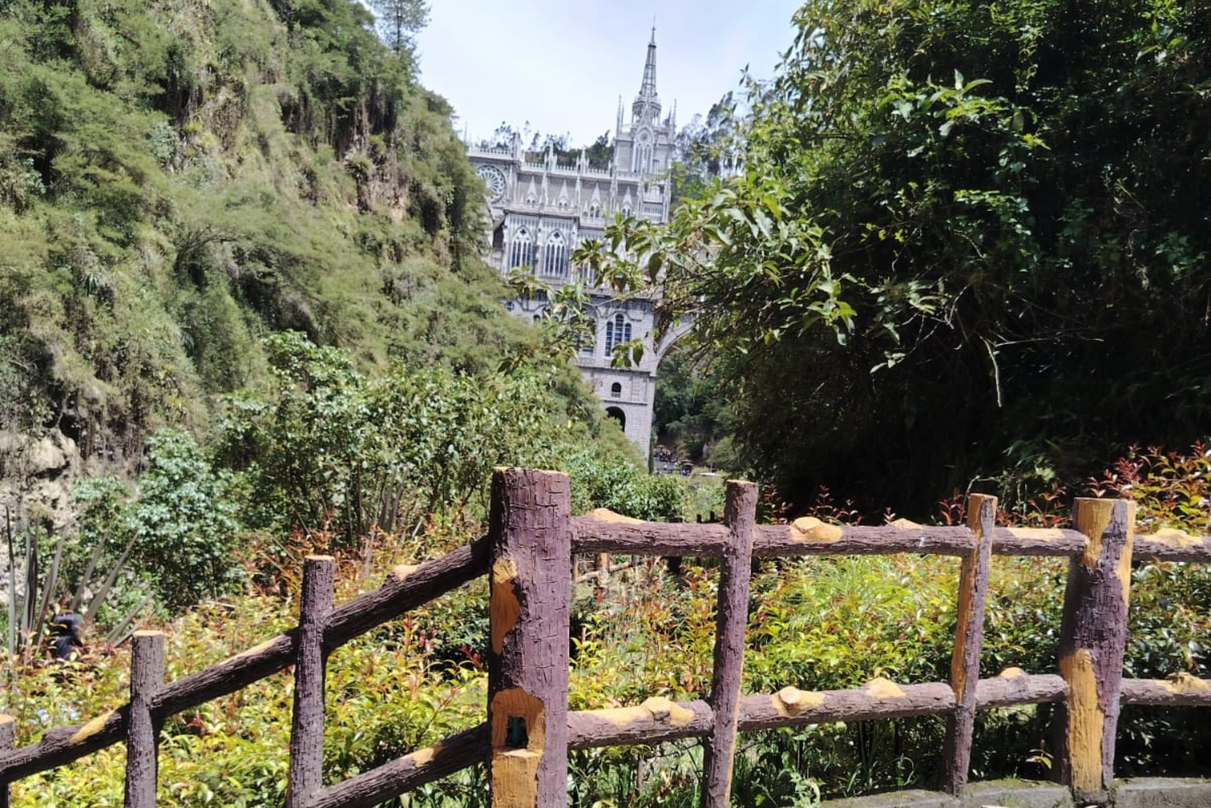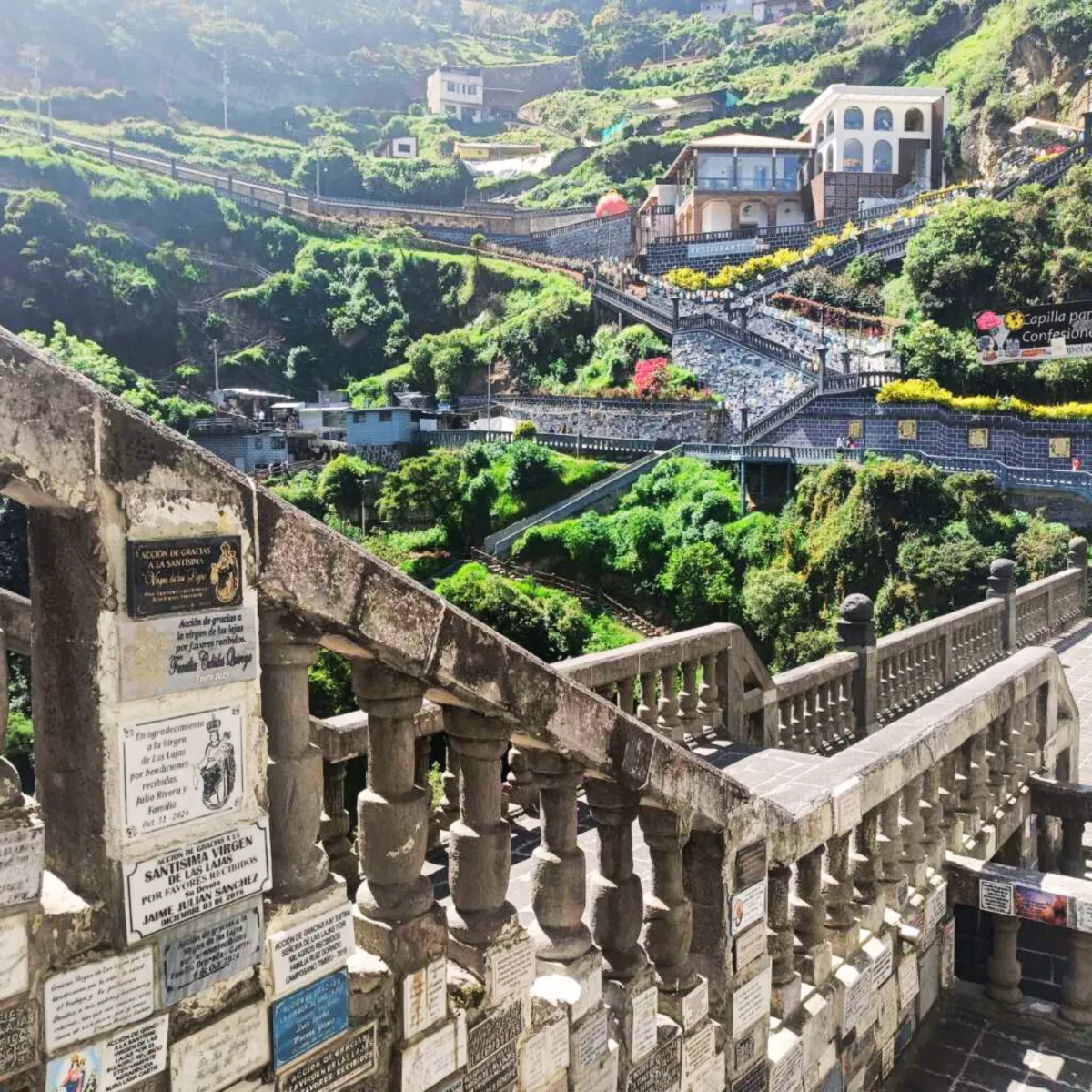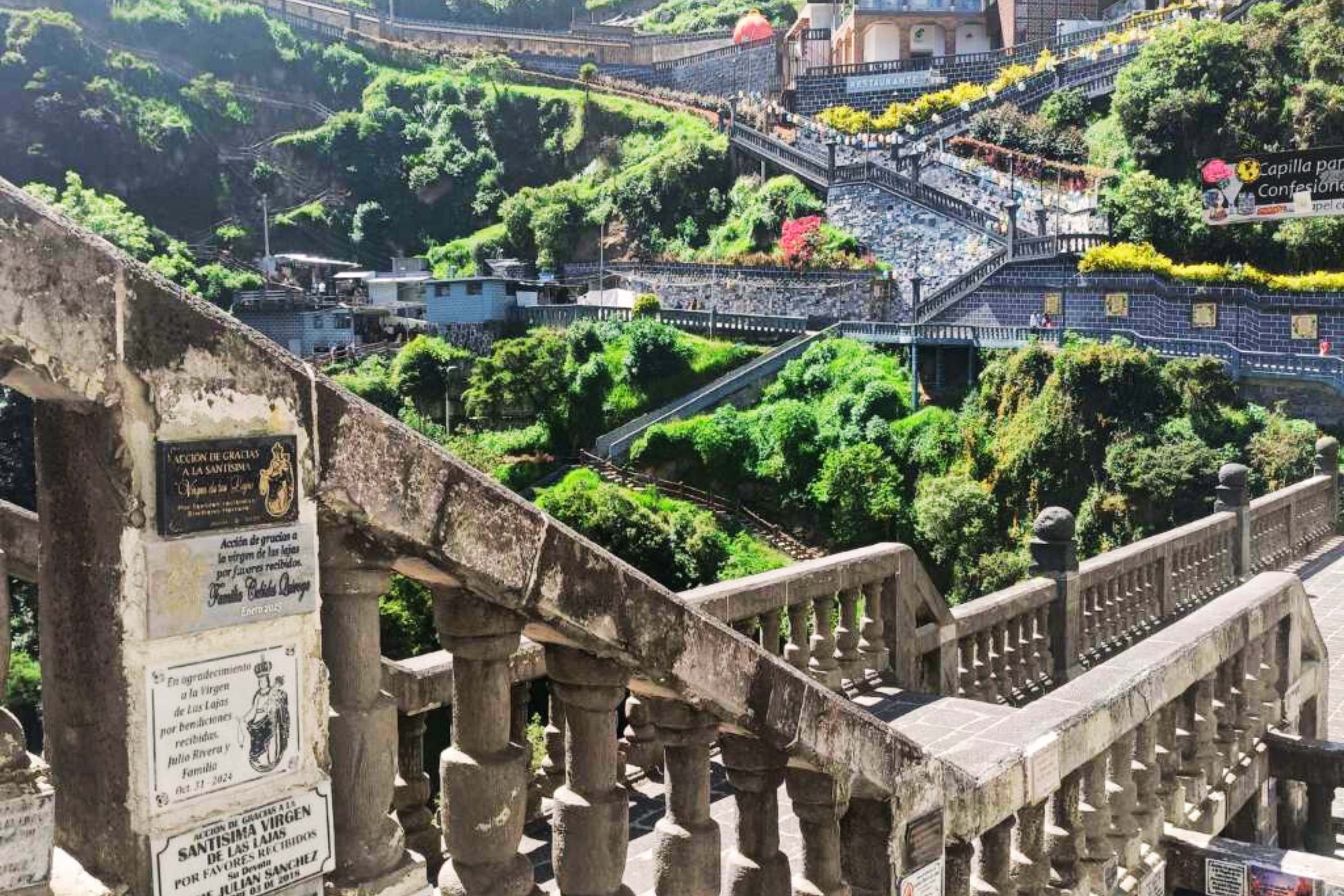 El camino hacia el Santuario de Las Lajas es una experiencia que combina naturaleza, historia y espiritualidad. A medida que desciendes por senderos empedrados y escalinatas, el paisaje se abre paso entre montañas verdes, paredes rocosas y el murmullo constante del agua.
