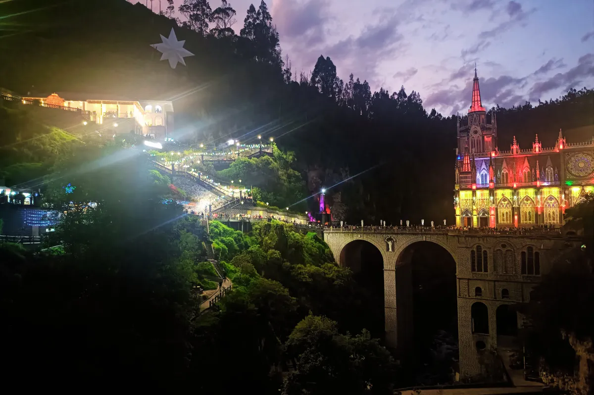 En la noche, el Santuario de Nuestra Señora del Rosario de Las Lajas se transforma en un espectáculo sobrecogedor donde la fe, la arquitectura y la luz se funden con el paisaje natural del cañón del río Guáitara.